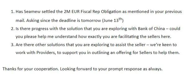 美鸥的意大利税务团队收到了来自亚马逊卢森堡总部的邮件通知,向我们了解关于中国卖家对于意大利担保金新政的对策以及市场反馈,美鸥已及时回复亚马逊总部。