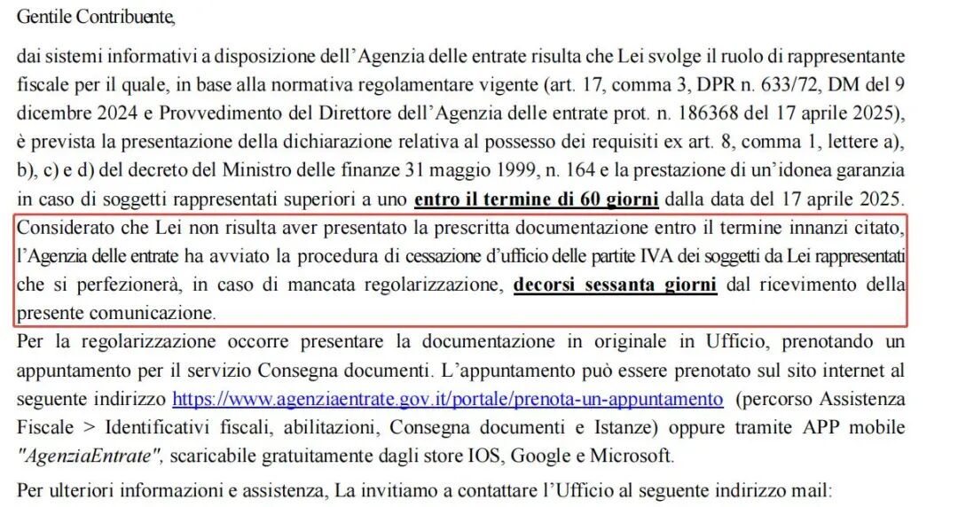 税局明确要求:税务代理需缴纳200万欧元保证金,以确保其名下客户的意大利本地税号在60天内不受影响。 美鸥跨境已全额完成保证金缴纳,您的税号安全性得到官方保障(附税局文件)。请放心,我们美鸥专业团队将持续为您守住合规底线。