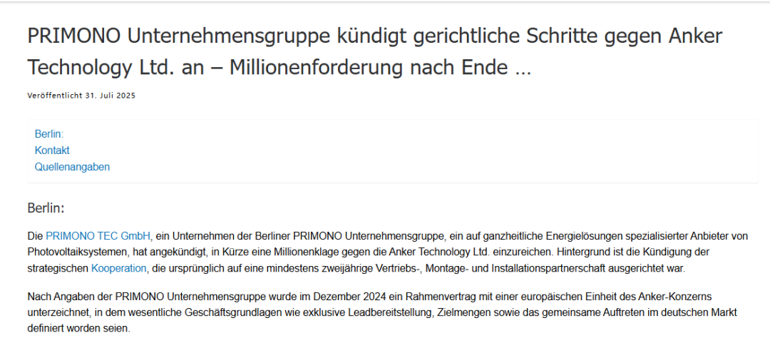 Primono 的总经理也说到:“我们催了好多次,安克一直没解决,这生意没法做了!” 于是,Primono 干脆终止合同,转头就起诉了安克,要求赔偿直接损失和间接损失。虽然具体金额没说,但相关消息透露怎么也有数百万欧元。 面对起诉,安克这边回应得很谨慎:“案子正在处理,不方便多说,但业务运营、产品供应都不受影响,我们会依法办事。” 话虽这么说,但懂行的都知道,德国市场是安克储能业务的重要阵地,这官司要是处理不好,恐怕会影响它在欧洲的口碑和扩张计划。