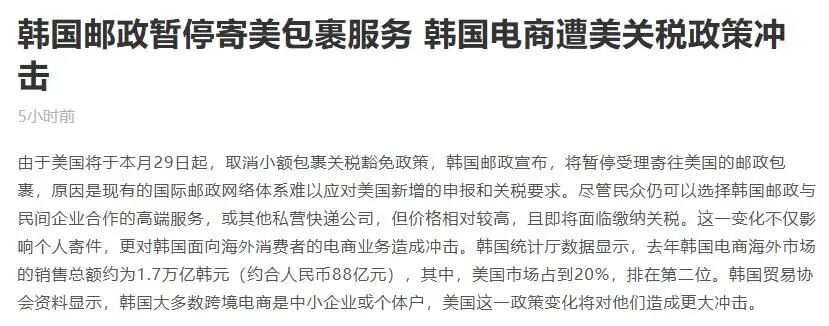 韩国邮政这边也宣布受美国取消小额包裹关税豁免政策影响,将暂停受理寄往美国的邮政包裹,原因是现有的国际邮政网络体系难以应对美国新增的申报和关税要求。