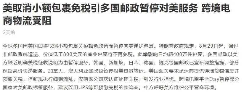 到了7 月,政策范围又扩大了,美国宣布推动取消全球小额免税,并定于8 月 29 日全面生效。