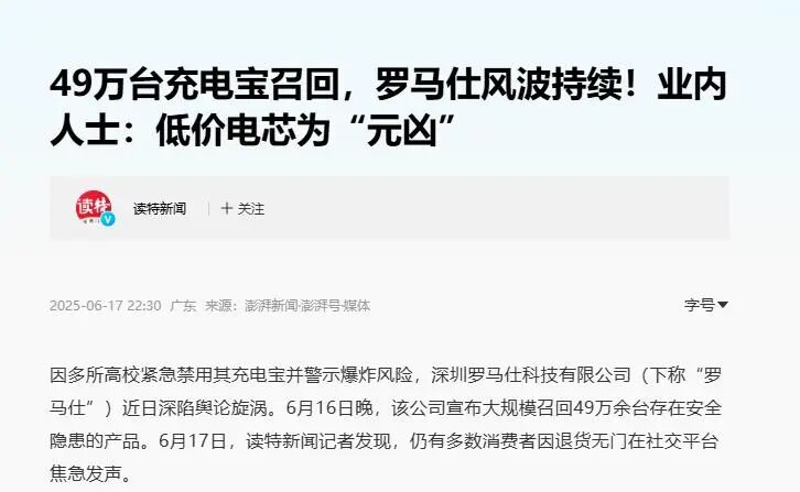 前段时间,罗马仕刚刚经历了一场严重的召回风波。 今年 6 月,北京多所高校传出消息,称罗马仕 20000 毫安的充电宝在充电时,相较于其他品牌,爆炸的可能性更高。 消息一出,迅速在网络上发酵,“多所高校禁用罗马仕充电宝” 的话题瞬间冲上热搜。紧接着,罗马仕不得不宣布召回共计 49 万余台充电宝。