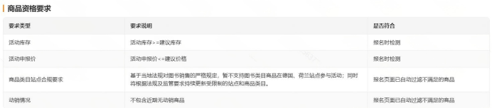 库存不低于建议量、申报价格不高于建议价、商品类目符合站点合规要求、近期有动销记录